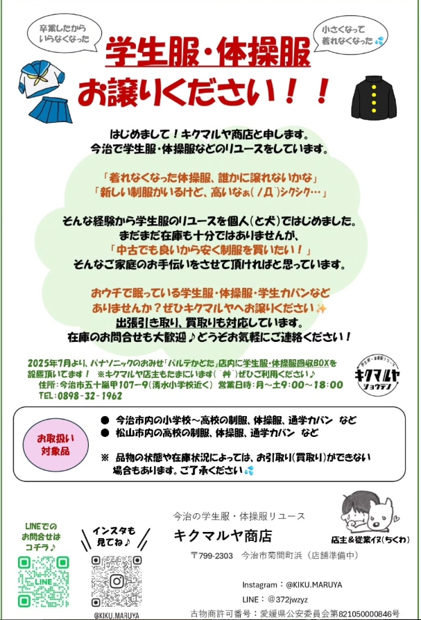 STAFF BLOG ★不要になった制服譲ってください~!!★ 2025.11.07 こんにちは😃 パルテかどたです👍 小学校、中学校、高校の不要になった制服や 体操服などを探してます🔍 不要になった制服や体操服などあれば、 当店かキクマルヤさんまでご連絡下さい🙇 お引き取りにお伺いもさせて頂きます🚗 #小学校 #中学校 #高校 #リユース #制服 #体操服 #キクマルヤ #パルテかどた Tweet Share Hatena 前の記事 次の記事